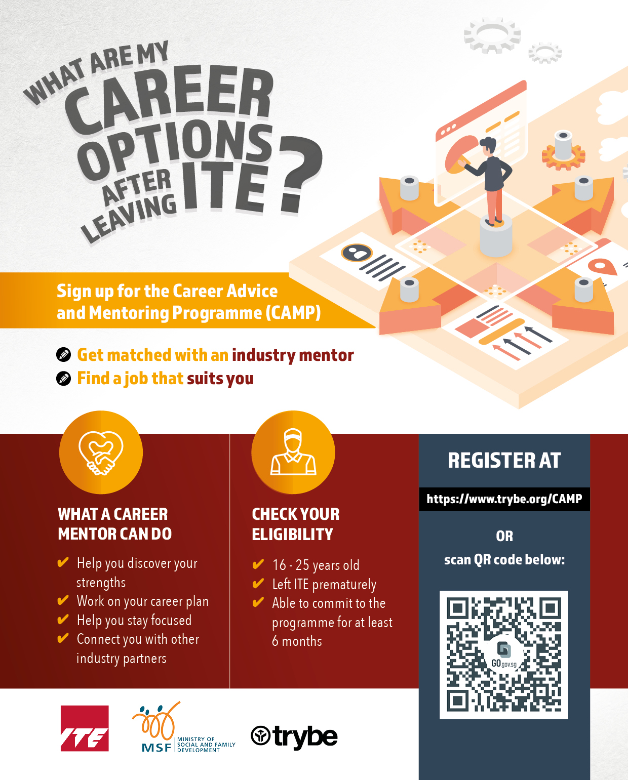 Career Advice and Mentoring Programme (CAMP) involves career mentorship for youth who have left ITE prematurely. We help young people prepare and qualify for suitable jobs by creating a structured career plan and connecting them with industry partners.